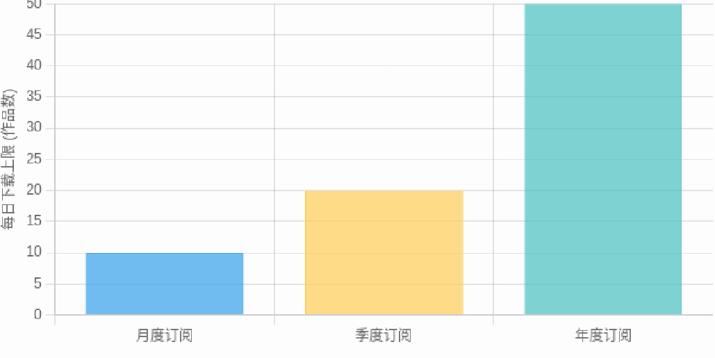 3.1本平台的订阅服务采用不同时长的会员计划,用户可根据需求选择月度、季度或年度订阅。不同订阅计划对应不同的付费金额和每日下载上限。具体的订阅方案、价格及下载限制以平台公布的信息为准。用户确认订阅并完成支付后,将获得相应时长的会员服务。 示例:不同订阅计划的每日下载上限对比